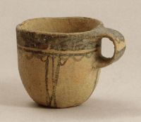 说 明: 泥质褐红陶。器表绘黑彩带条纹与锯齿纹。造型别致,小巧玲珑。