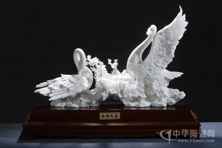 《永恒之美》是中国传统美好的一个象征。两只白天鹅悠闲自在,用她们间的和谐、温馨诠释着生命的美好、生活的美好。细看整件作品,胎质细腻,如脂似玉,莹润如水,线条优美柔和。梅花、牡丹等花瓣是纯手工捏制而成,烧制难度极高,精雕细刻,洁白高雅,完美地表现出了花之魂。