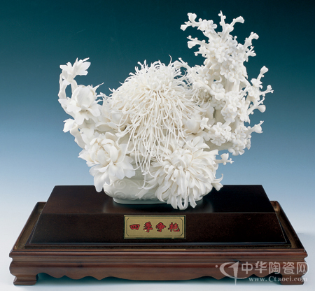 《四季争艳》长39cm,宽18cm,高34cm,以德化特有的温润如玉的“中国白”为胎质,洁白细腻,素净淡雅。作品主要通过牡丹、梅花、菊花等蕴含传统美好意愿的花卉来表现,每一朵瓷花都可以以假乱真,每一朵瓷花的盛开过程都是一种神奇,都是对生命的礼赞。四季的结合更彰显出生命的繁华与生机,表达了对生活的热爱之情。(苏晓霞)