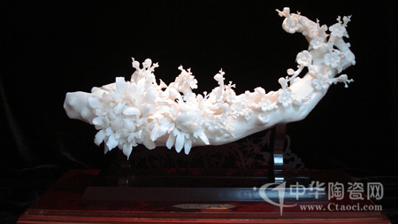 《梅竹争艳》是周秀燕的呕心沥血之作,长33cm,宽21cm,高37cm,经过1300多度烧制而成。周秀燕主要采用了梅、竹这两个题材,通过德化特有的“白如雪、润如玉、透如绢”的优质瓷泥,塑造出了栩栩如生、人见人爱的瓷花。