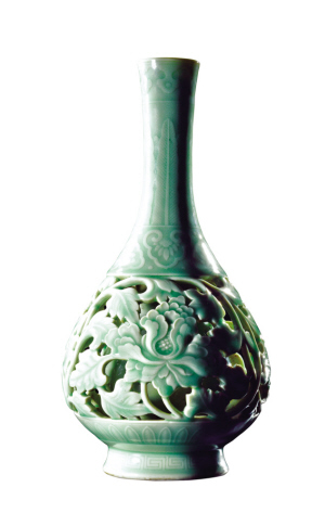 香港苏富比昨日举行的“玲珑八宝──欧洲私人清宫御瓷收藏专场”,八件拍品全部卖出,其中卖得最好的是清乾隆粉青釉浮雕芭蕉叶纹镂空“缠枝牡丹图”长颈胆套瓶,事前估价1500万至2000万元,结果以4770万元成交。该长颈胆套瓶由欧洲私人收藏家在上世纪六十年代收集,逾四十年来从未曝光。