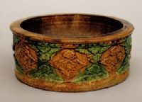 说 明: 淡黄色陶胎,较坚硬,上白色化妆土,内施黄釉,纹饰讲究对称,作工精巧.