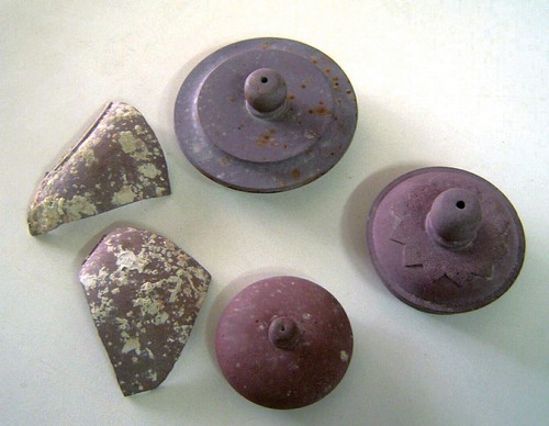 2004至2005年间,由瑞典海洋考古学者史坦(Sten Sjostrand)成立的南海海洋考古公司(Nanhai Marine Archaeology Sdn. Bhd.)与马来西亚政府合作,在马国西岸的Terenganu省Tanjong外六海里处,打捞了一艘明天启年间(约1625年)的葡萄牙货船,该船可能是由广州驶往马六甲的途中因故沉没。史坦命名此船为“万历号(the Wanli)”。该船的出水物主要是明代万历时期的外销瓷器,紫砂器极少,只捞起3只壶盖与两片破片(图1),俱为圆器,其中一个壶盖以珠钮为中心,贴饰12棱的星形泥片,上面并押印一圈连续涡纹。这是目前已知水下考古中年代最早的出水紫砂壶。