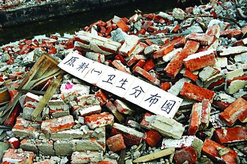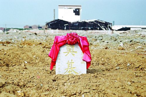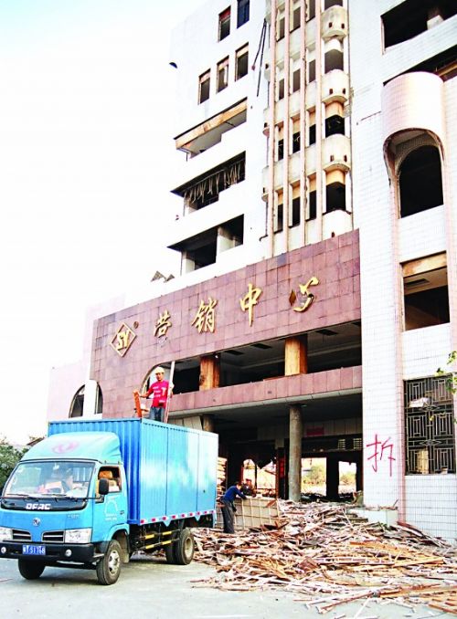 在原陶瓷厂址上树立的购物商场奠基牌,远处的厂房还未完全拆完