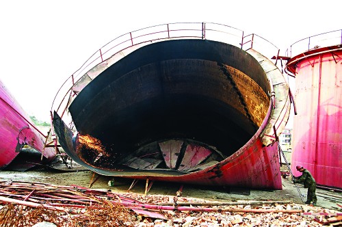 工人正在切割陶瓷厂用来装重油的油库,几个巨大的油库可见这个陶瓷厂的规模很大