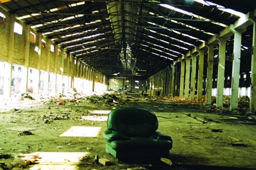 空旷的厂房内只剩下一个守厂工人坐的沙发。厂内设备拆完后,厂房马上也要拆除了