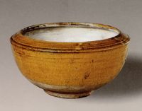 说 明: 因胎土粗糙,故施黄釉之前现势一层洁白化妆土。为壁施黄釉不到底。