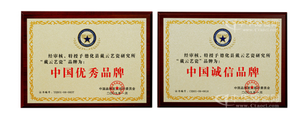 每一个人都是自身的品牌,一家企业也一样,品牌就是影响力。经过多年来的生产、经营,戴云艺瓷研究所一直获得好评,唱响国际。2009年1月,中国品牌发展组织委员会经审核,特授予德化县戴云艺瓷研究所“戴云艺瓷”品牌为“中国优秀品牌、中国诚信品牌”。这不仅是对戴云艺瓷的高度评价,而且在金融危机品牌意识提升之际,此荣誉进一步提高了戴云艺瓷的竞争能力。