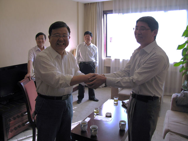 孟国强会长(左)会见杭州诺贝尔集团副总经理杨伟东(右)