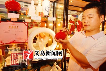 在2009中国义乌文化产品交易博览会工艺美术作品评选中,德化陶瓷选送的《和谐》、《春风得意马蹄疾》、《鸡毛换糖》、《贵妃醉酒》等4件白瓷工艺美术作品,分别获得金奖、银奖和铜奖。德化陶瓷精品馆总经理陈济金说,我们以此次获奖为动力,努力开发陶瓷工艺新产品,为义乌市场繁荣多作贡献。图为陈济金在逐件检查上柜精品陶瓷。