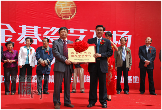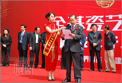 县委常委、宣传部长涂健圻为中国瓷都·德化迪云舟陶瓷西北营销中心授牌、县政府副调研员黄发建代表陶瓷产区讲话并向金碁瓷艺广场赠送礼品,中国陶瓷工业协会、陕西省、西安市等领导出席授牌仪式。