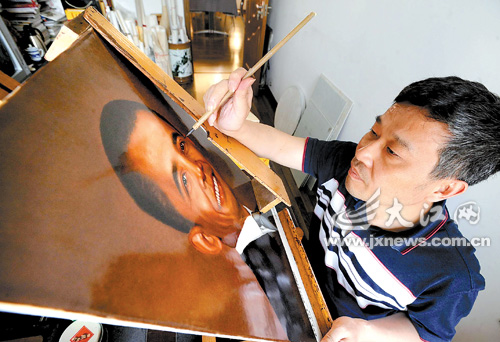高级工艺美术师、江西省工艺美术大师王跃林正在创作美国总统奥巴马肖像。