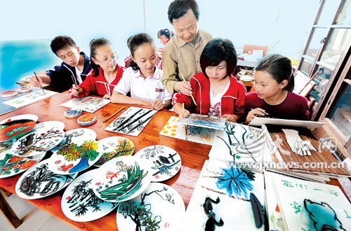 南昌市二十八中学生正在老师的指导下学习画瓷板画。