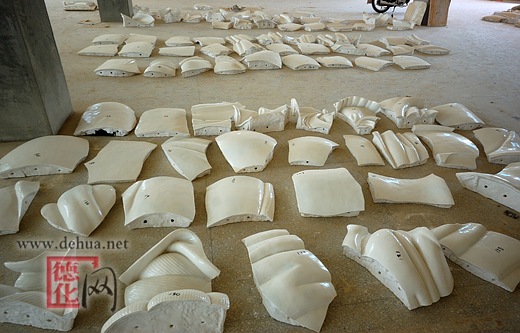 模具成型后,又将其无规则地分解成138块,其中身体137块,头部、脸部组成1块,然后从头到脚对每一块进行统一编号。接着创作人员参照模具雕制出每一块坯体,坯体的厚度均在3厘米--5厘米以上,最厚的达20厘米以上,是平常烧制艺术瓷的100倍。头部坯体高140厘米,宽110厘米,厚80厘米,重约250千克,需6个人同时出力才能翻动它。