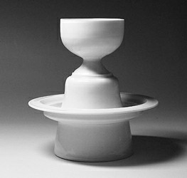 这只南宋湖田窑青白瓷素盏,造型简约,线条流畅,无任何装饰。通高:15.2厘米,杯:口径8.3厘米,足径3.8厘米,托:腹径14厘米,足径9.2厘米,杯为敞口,深腹,高圈足外撇。托为折沿口,台阶式浅腹,高圈足,托中央设一高台,台边缘凸起一周托圈,圈内仅容杯足于内。杯与托通体施白中闪青的青白釉,仅底部露胎。杯足积釉甚厚,如镶玉于上,器型清秀典雅,令人回味无穷。茶盏传递给我们的是一种端庄、恬静、淡雅之美。