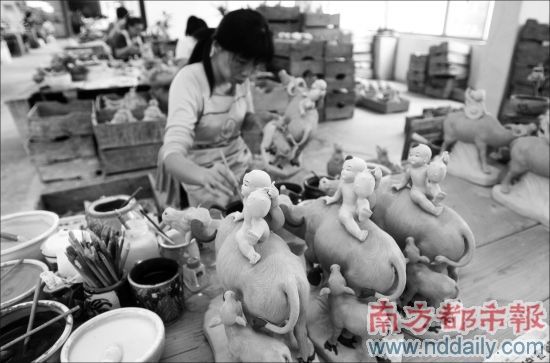 我本来是在石湾湾江艺术陶瓷厂工作的,1997年佛陶集团重组,就被纳入了美术陶瓷厂。2003年我44岁时,被评上中国陶瓷艺术大师,是入选国家级陶艺大师中最年轻的。在美陶厂工作,老前辈比较多,大家经常交流,他们也会给我提意见。而每年我们同题操作的题目就是做生肖公仔,每人做数款,然后大家评价再选一些款式投产。