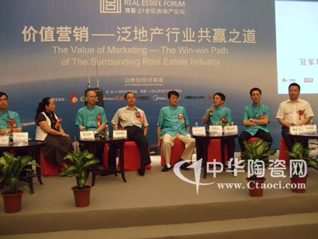 在该论坛上,何新明表示,东鹏陶瓷通过创新产品,通过优质品质,通过一流服务为客户创造价值。从96年率先引进玻化砖并通过开创畅销至今的经典产品“金花米黄”,引领了行业“一片黄”的热潮;在2000年通过天山石抛光砖带动行业的“一片白”新潮流,在07年东鹏开创具有国际专利的洞石带领行业“一片洞”,去年推出纳福娜洞石,09年则演变成行业“一片福”,通过创新带动整个行业技术的发展,也领导了行业新产品的潮流。因此,何新明认为,房地产跟陶瓷、家具等泛家居行业是唇齿相依的关系,东鹏高价值的产品自然提升了房地产空间的价值。他还指出以东鹏陶瓷为代表的冠军联盟给开发商和消费者可以带来更大的价值。“如同一套优质的名牌西装能够提升一个人的气质和品位,我们的陶瓷和我们冠军联盟的家居类产品就像是房地产产品的优质名牌西装,我想通过我们创新的产品,也通过我们6家冠军企业品牌的联盟来提升我们房地产的价值,来推动泛地产的价值是完全可以做到的”,何新明言简意赅,信心十足。