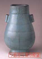 宋代瓷器的质地、釉色、式样、产量都远远超过前代,钧窑、汝窑、哥窑、官窑、定窑被誉为当时的五大名窑。官窑是指由中央官府开设的窑场,专门烧制御用瓷器,其中有不少是仿古造型的陈设品。这件官窑贯耳瓶即仿自古代青铜投壶造型,直口阔腹,瓶侧筒状贯耳与足部两侧长方孔相对应,可以穿系绳带。此瓶釉色厚润,端庄典雅,是宋代瓷器中的珍品。