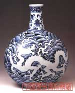 此瓶是由景德镇御窑厂制造的。它圆口、长颈、扁圆腹、平底,腹的两面饰满青花海水,各有一条白龙,扬爪腾身,出没于惊涛骇浪之中,颈部用青花饰以卷草纹、缠枝莲纹各一道。这是宣德年间(公元l426~l435年)青花瓷器中的典型产品。明永乐、宣德年间是中国青花瓷器生产的成熟阶段,其产品以造型清秀典雅,胎体薄,纹饰凝重,青花颜色鲜艳而著称于世。