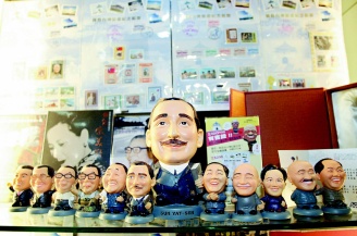 什么商品最受陆客欢迎?吴松洲指着玻璃柜里一排“政坛明星公仔”,包括抱黑猫白猫的邓小平、手拿十大建设蓝图的小蒋,还有马英九、萧万长等,笑说这是店里的“招财猫”,许多陆客一买就是二十几个。