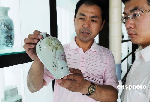 由山东省工艺美术大师、陶瓷艺术大师李秋峰历时半年创作的一百四十件刻花鲁青瓷梅瓶,于六月三十日启运上海世博会。在这一百四十件高零点二0米的刻花瓷瓶上,刻有上海市花玉兰花和象征台湾的蝴蝶兰,还有“世博缘两岸沪台青少年千人歌会特别纪念二00九 上海”字样。这批鲁青瓷梅瓶将于上海世博会期间,赠送给前来参加活动的台湾各学校的校长。图为山东省工艺美术大师、陶瓷艺术大师李秋峰(左)在展示刻花鲁青瓷梅瓶。
