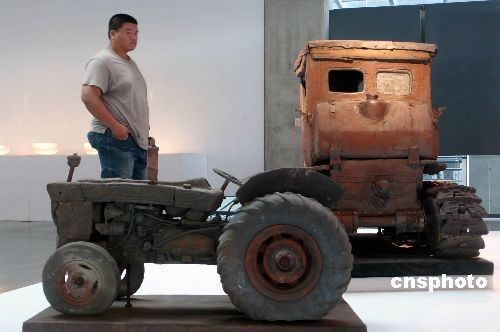 中国美术馆委托中央美术学院雕塑系教授吕品昌策划的“文思·物语——大陆当代陶艺展”,6月3日在台湾陶艺重镇台北县莺歌镇揭幕。图为一台北观众在观赏钞子艺、钞子伟兄弟仿上世纪五六十年代大陆农用拖拉机制作的陶瓷作品《劳力士系列》。中新社发刘舒凌摄