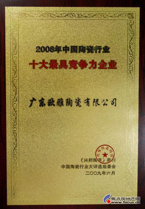 欧雅荣获2008年陶瓷行业十大最具竞争力企业