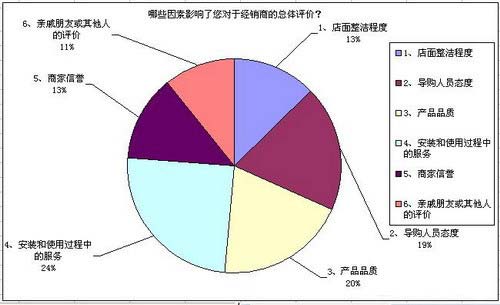 而具体到是哪些因素影响了对于经销商的总体评价,24%的网友表示是安装和使用过程中的服务影响了他们对于经销商的评价,产品品质作为一个重要因素占到了20%的比例,而作为与顾客的直接接触者,导购人员的态度占了19%,此外,商家信誉和店面整洁度各自占有13%的比重,而亲戚朋友或者其他人的评价占到11%的比重,口碑传播是陶瓷卫浴产品选购的一个重要决定因素。