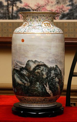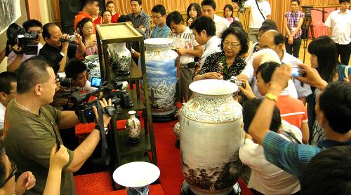 7月20日,观众在观展。当日,由中国古陶瓷工艺美术大师黄云鹏等主创的“江山如此多娇——新中国成立六十周年国瓷艺术展”在北京全国政协礼堂举行首展活动。展览共展出作品19件,其中2件是传统与现代结合的瓷艺大器,分别为“江山如此多娇”和“开国大典”,17件为高仿元明清陶瓷艺术品。