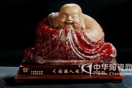 据陈国钦先生介绍,《福满人间》是戴云艺瓷窑变工艺的代表作品,是一件还原数百年前的铜红釉瓷弥勒佛像,是先用废弃瓷砂土雕制成型,再在衣饰上施上铜红釉,再经过1310℃—1330℃还原焰高温窑变烧制而成。所谓窑变是指器物在窑内烧制时,由于窑中含有多种呈色元素,经氧化或还原,出窑后会呈现意想不到的釉色效果。