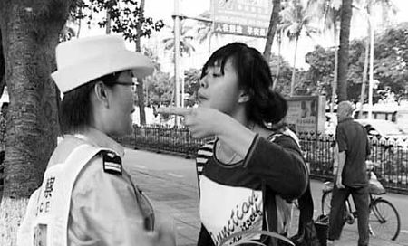 7月14日《南国都市报》报道:被拘女大学生言行录:1翻越护栏横穿6个车道;2辱骂交警:“你她妈的xx,我x你妈。”3抢过交警摄像机准备砸在地上;4召来3名朋友与警方对峙。