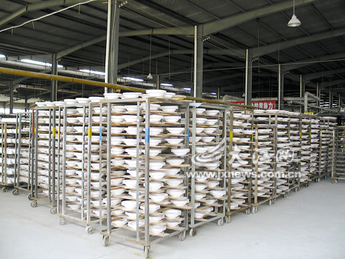 7月17日,是“宝蓝瓷”生产线熄火停产后的第40天。记者走进景德镇环球陶瓷公司生产车间,只见6万多件泥坯整齐地存放在坯架上,窑炉已经熄火,生产线上不见工人身影。再走进5000多平方米的成品仓库,只见30多万件成品瓷占据了大部分空间,瓷器随意地裸堆在地上,洁白的釉面蒙上了厚厚的灰尘。这一切,与4个多月前热火朝天生产“宝蓝瓷”的场景形成了极大的反差。