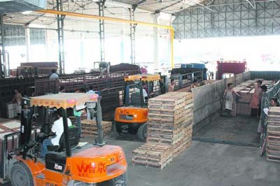 厂房内,机器轰鸣,三条生产线上的作业工人忙于将抛光砖成品从流水线上取下,三台叉车在车间来往穿梭,将仍冒着热气的瓷砖径直送到车间门口。车间是敞开式的,为运货汽车留有两个专门的装货口。每个装货口并排停着三辆加长的汽车,都已装了大半车厢的产品。