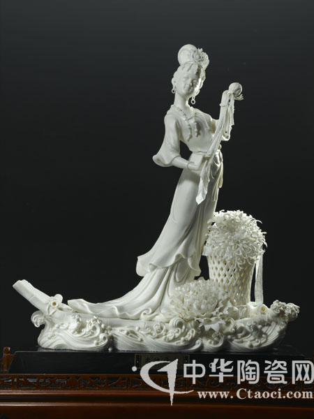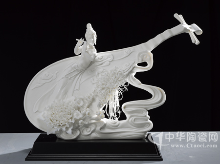 比如《和谐共鸣》,她是以德化优质瓷泥为载体,演绎出了和谐之声。一位美丽的飞天女与古典乐器琵琶紧紧融合在一起,飞天女吹着笛子,笛声悠扬飘荡,与琵琶声产生共振、共鸣,奏出了和谐之声,昭示着渴望世界、社会的和谐,家庭的和谐。