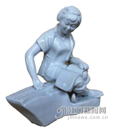 此尊德化瓷塑取名“日进斗金”,通高17.5厘米,背面有“德化陶瓷厂出品”字样,为福建德化陶瓷塑厂的“文革”外销瓷。古代吉语有“日利千万”一词,后被艺术家所用,改为“日进斗金”。早期或绘画或雕塑,人物造型以帐房先生为多,民国以后逐渐改为少女形象,而此尊塑像又多了“文革”的特有印记,故十分珍贵。(江门日报 第7237期 A15版)