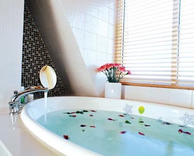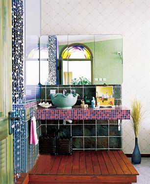 图解:二:半开放式风情浴室 巧妙利用百叶、珠帘等软隔断将空间进行一次分隔,开“开放”的基调上制造“私密”,给自己一个灵活的选择。 1、格局要素:卫浴间矮墙隔断巧妙分隔空间。 2、材质要素:亮片珠帘为卫浴间营造妩媚浪漫。 3、器物要素:卫浴间外的洗手池使用很方便。