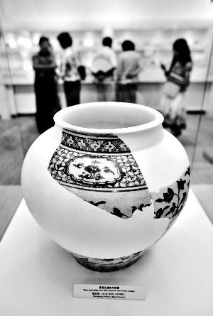 观众在欣赏复原的毛家湾瓷器。昨日,近300件毛家湾瓷器坑出土的瓷片在北京艺术博物馆展出。