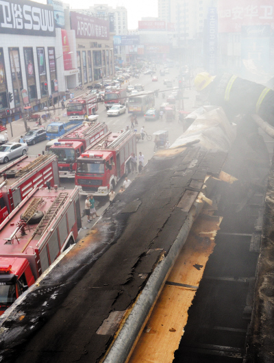 据现场救援的消防官兵介绍,起火点位于陶瓷商场二楼西侧,由于牌匾、房盖、临街外墙装饰材料都是易燃物质,给扑救带来很大困难。明火被扑灭后,这些易燃物还在冒烟并有死灰复燃的危险,消防官兵只能不停地打水、破拆排除火患。
