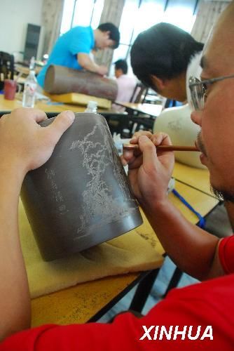 8月15日,一位选手参加宜兴陶刻大赛。为传承陶瓷文化,促进陶艺创新,培养和发现陶刻高手,8月15日,江苏宜兴陶刻大赛在宜兴市陶瓷行业协会礼堂举行,50余名中青年陶艺工作者参加了壶艺、陶盘、杂件、花盆等项目的角逐。