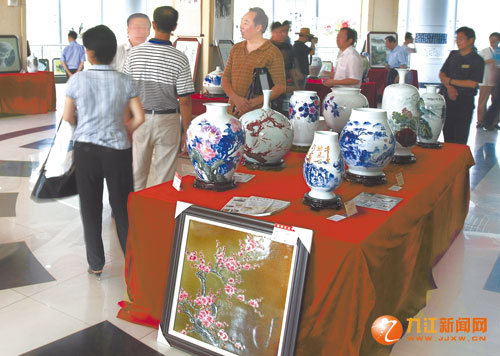 昨日,首届九(江)景(德镇)著名陶瓷书画艺术大师作品展暨交流笔会在市少儿活动中心拉开帷幕。