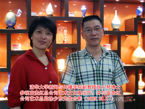 作为大赛评委之一的中央电视台《心理访谈》栏目主持人、1996年全国电视节目主持人大赛金奖及2001年“金话筒奖”获得者、现清华大学新闻与传播学院副教授张小琴老师于8月17日慕名来到中国瓷都·德化,参观了福建省富贵红文化发展有限公司陶瓷艺术文化展示厅。富贵红公司官窑文化研究所艺术总监徐少东兴致勃勃地向张小琴老师讲述德化陶瓷悠久的历史及富贵红陶瓷艺术的工艺特色,并逐一讲解每一种工艺品类的工艺内涵及作品的创作构思。