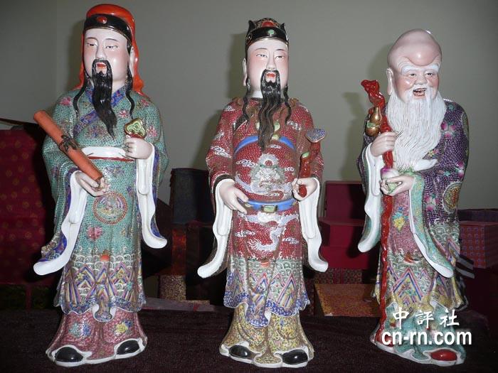 现场的珍品当中,有来自景德镇老艺人曾龙升的作品“陶瓷观音”及“福禄寿”等一共四件,曾龙升的名气在华人地区赫赫有名,目前他的作品,在景德镇当地都很难找得到。