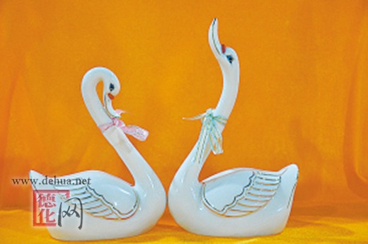 瓷雕“天鹅”,一雌一雄,引颈高歌,造型别致。高分别为19厘米和25厘米,宽为15厘米和16厘米;系高温烧制,描金、具有实用和欣赏价值。