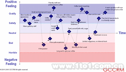 以下是一个单线程的客户体验镜像,由Sampson Lee先生提出并融合了他在访问星巴克期间的心得体会。它从Sampson的角度出发向我们展示了他与星巴克之间的互动。同时该镜像也糅合了反映Samson在流程每个阶段感受的因素在里面。思考一下第五条和第七条——‘排很长的队’和‘咖啡要等很长时间’。Sampson也许赶时间,所以将这些归为负面体验。但如果他在排队时碰到个很久没见的老朋友也许他的想法就完全不同了,因为排长队的时间让他有机会了解到这位朋友可能在计划举办一次社交活动之类的讯息。