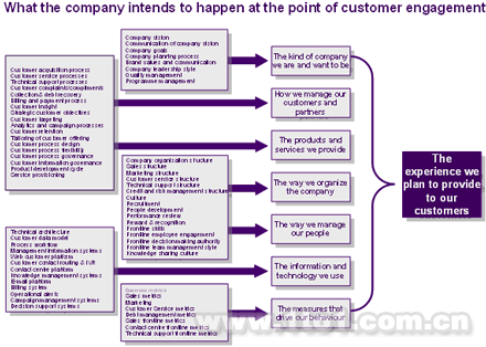 评估客户体验的各个组成部分然后利用系统化思维逐层分析其建立过程,最终你将发现所有必须具备和必须进行管理的能力。下图向我们展示了如何剖析能力从而从内部观点——“企业期望发生的”和外部观点——“客户的实际体验”两方面找出客户体验的根本动力。