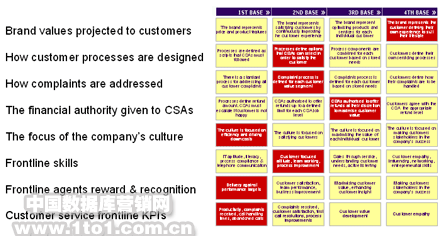 上面的能力镜像图表明新品牌的价值观倾向于能够极大地提升客户期望的第四垒。同时客户处理流程和培训设置在第二垒而决策制定在第三垒,集中体现为海报广告和管理层‘干涉’,主导文化仍由成本推动。当这些与第一垒的绩效度量(呼叫处理时间) 和第一垒的奖励与认可计划 (呼叫处理数量) 碰在一块时 产生的效果就是在退赔偿及其它客户参与的实际行为中制造出大量不协调因素。在评估之前企业并没有看到这一点。而一旦看清楚这张图解决方案也就呼之欲出了。