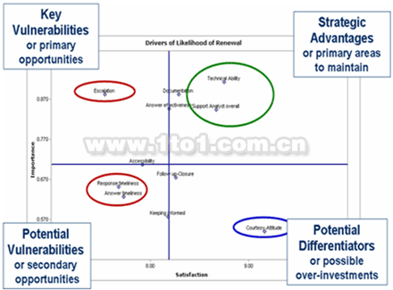 目标化客户反馈能够提供与能力直接相关的关键外部数据来源。看看以下来自CustomerSat公司的图表。它识别出了企业未能满足的重要需求(左上部框) 。Customer Sat工具随后对现有数据进行进一步的分析或者触发事件搜集新数据从而精确指出影响成果的能力。一旦这个问题明确之后Round能力管理系统就会框定和追踪弥补缺憾所需的能力的开发进程。