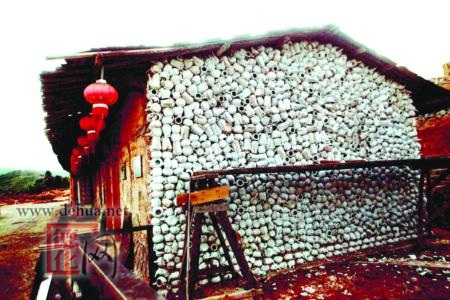 从窑场出来,忽然看到边上一座特别的房子,整堵墙都是用各种样式、大小不等的茶壶垒成。原来,几个月前,十几名外国人来到古窑旁边,他们把附近窑口烧坏的次品茶壶捡出来,搭成了高2米多的白色茶壶墙壁。