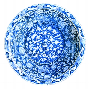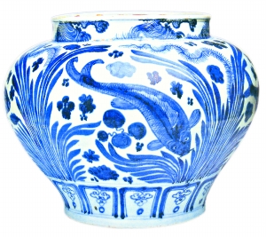 另外,这些青花瓷都是专门为出口贸易所设计的,因此带有中西结合的特色。“唐代到元代统治者都很喜欢单色釉,元代宫廷用瓷也是以单色瓷为主,而元代青花瓷很多是为了伊斯兰文化而特别设计的。”蒋女士谈道。比如,一件花卉图案的大盘没有韵散,便是用了“撒蓝”的技法——在画完了纹饰以后,又把钴料喷洒在上面,所以可以感觉到这个器物上面朦朦胧胧有一层蓝色;再如,整个的青花瓷它的装饰很满,器形也较大,这些都很符合当时的伊斯兰文化,表现了他们对青蓝的喜好。