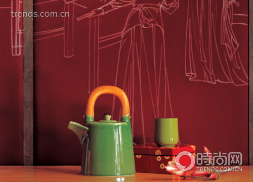竹节手柄配合清新的绿色茶壶,在红色背景衬托下,让东方的釉色更显清爽自然。